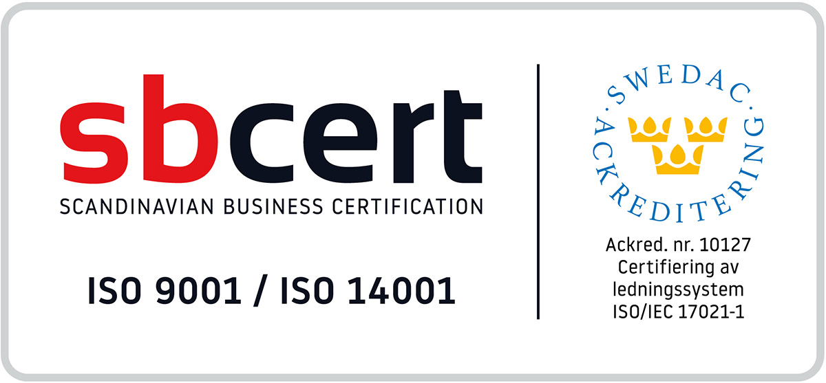 Till vår hjälp för att upprätthålla detta har vi årligen ett av SWEDAC:s ackrediterade kontrollorgan på besök för att säkerställa ett starkt ledningssystem.