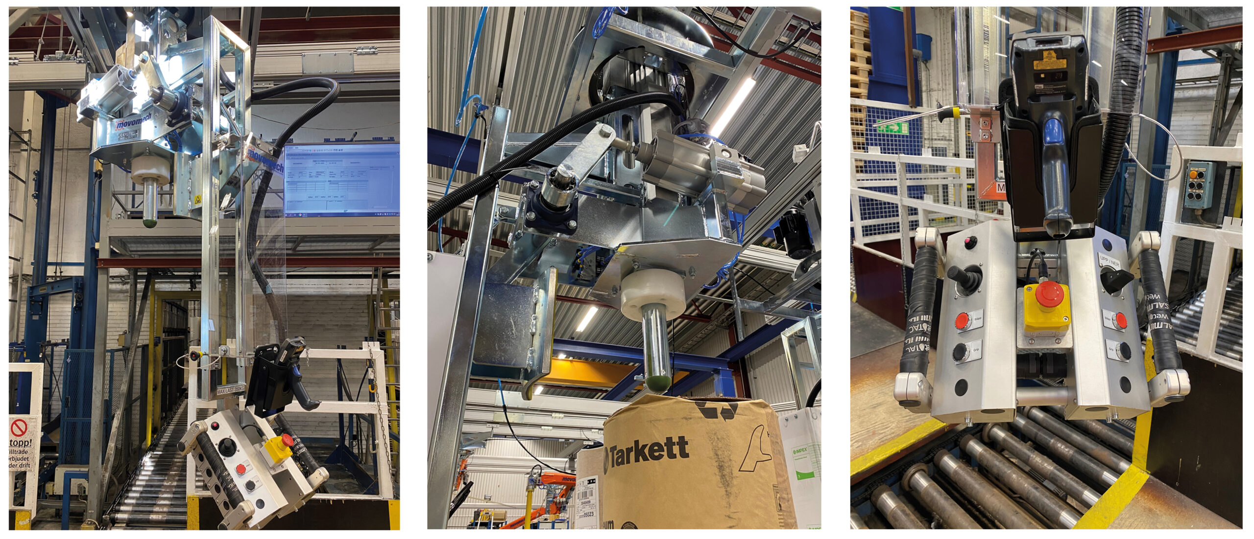 År 2002 kontaktade Tarkett Movomech med en förfrågan om att vi skulle ta fram en hanteringslösning som kunde förflytta deras mattrullar från lagerpall till orderpall. Detta resulterade i en arbetsstation med fyra styck Mechlift som löper i Movomech slättraverssystem MechrailTM.