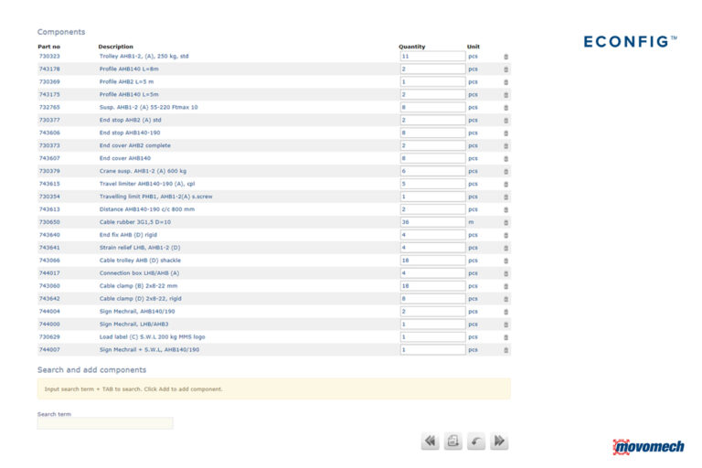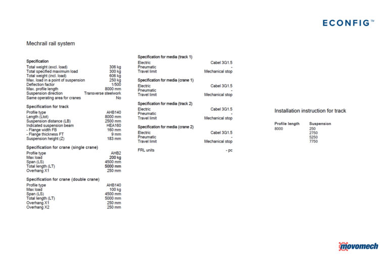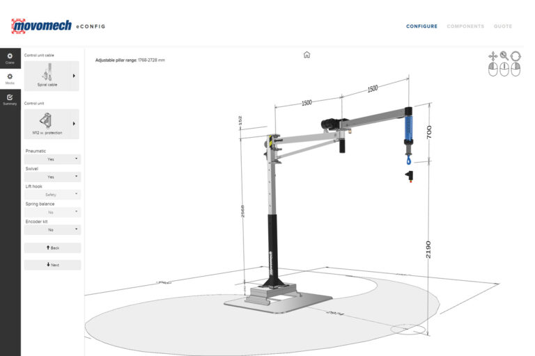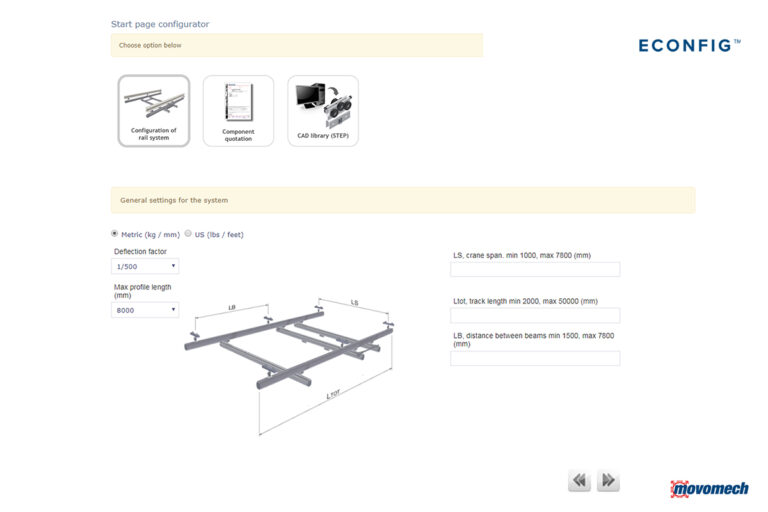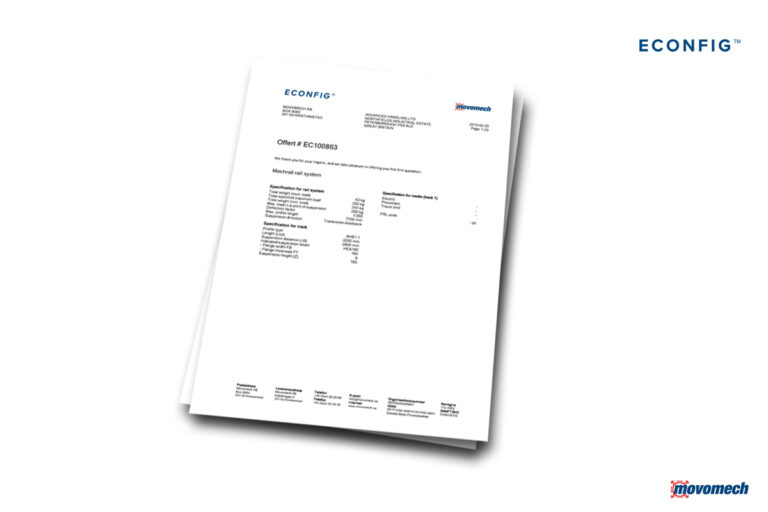 eConfig är ett intuitivt och lättanvänt konfigureringsverktyg för Movomechs produkter. Det ger dig full kontroll att skapa en unik lyftlösning för din applikation. I bakgrunden sköts all dimensionering automatiskt, så du inte behöver oroa dig för några beräkningar.