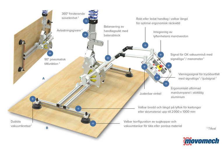 Movomechs modulära skivlyftverktyg Easypanel underlättar lyft av plåtar, kartonger, dörrblad och skivmaterial i många olika branscher och industrier. Konceptet har ett generöst antal tillval och konfigurationsmöjligheter för att varje lyftverktyg ska kunna anpassas perfekt för varje unik arbetsstation.